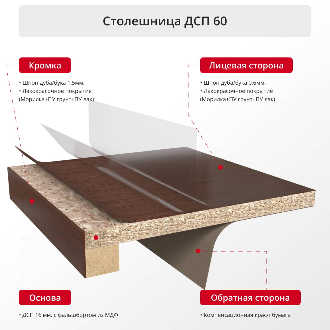 Столешница шпонированная 60мм (прямоугольная) шпон Дуба