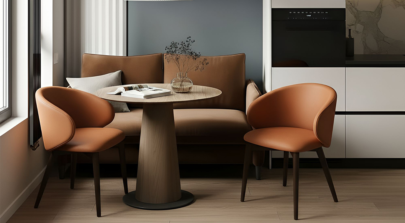 Такая комбинация материалов удобна в эксплуатации: дерево сохраняет тепло и стильный внешний вид, а кожзам легко очищается даже после активного использования в ресторане или дома.